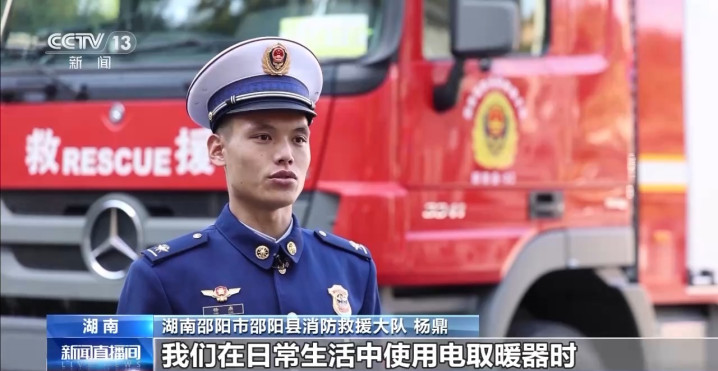 湖南邵阳市邵阳县消防救援大队杨鼎:我们在日常生活中使用电取暖器时,不要跟沙发等棉织物品放得太近,更不要在电取暖器上烘烤衣物,这样很容易引燃可燃物从而引发火灾。例如打火机、花露水、空气清新剂等一些易爆品更不要离电暖器太近,以免发生爆炸。当人员离开后,应断开取暖设备电源开关,防止长时间使用电器过热引燃周围物品发生意外。